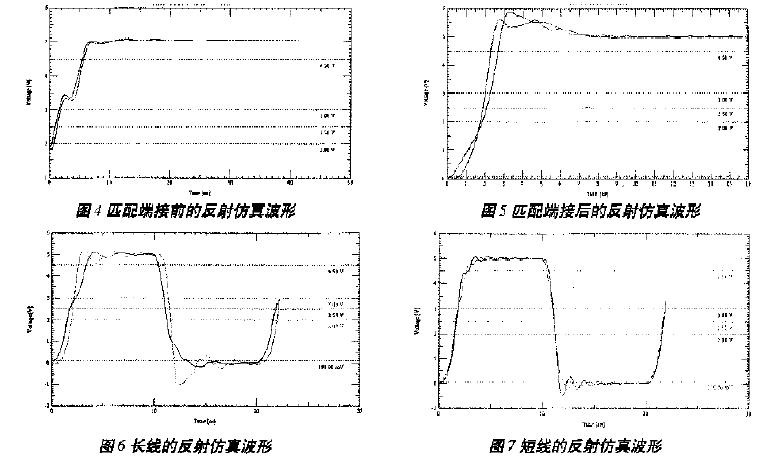 用頻率為50MHz,占空比為0.5的Pulse信號作觸發(fā),圖4和圖5分別為利用Signoise工具仿真得到的匹配端接前、后的仿真波形。從圖中可以看出,端接前,波形在上升沿有畸變發(fā)生,容易引起誤操作。匹配端接有效地消除了信號的畸變,單調(diào)性很好,而且在上升沿拉升了原信號,提前進入電平切換,增加了信號的穩(wěn)態(tài)時間,信號的上升沿也比較平穩(wěn)。雖然在高電平的維持階段有上過沖,但對信號確認(rèn)沒有影響,信號質(zhì)量比較理想。另外,信號傳輸線長度對反射也有一定的影響。仿真發(fā)現(xiàn),傳輸線較長時,出現(xiàn)了預(yù)示的反射現(xiàn)象,如圖6所示;而傳輸線較短時,仿真波形和分析結(jié)果吻合得很好,如圖7所示。表1為上述兩種情況下的波形仿真參數(shù)。所以,布線長度不同,其處理方法也應(yīng)不同。一般來說,走線長度小于2英寸,以集總參數(shù)的LC電路來處理;大于8英寸,則以分布參數(shù)的傳輸線電路來對待。