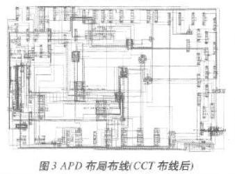 如上所述,MCM布局布線的實現(xiàn)包括電路原理圖生成、擴充零件庫及最終的布局布線完成和加工數(shù)據(jù)文件輸出。APD Layout包括Padstack(*.pad)、Package Symbol(*.psm)、Mechanical Symbol(*.bsm)、Format Symbol (*.osm)和Shape Symbol(*.ssm)五種,MCM布局布線設(shè)計中,所有的布局都必須有正確的Library Packing。MCM設(shè)計軟件自帶封裝庫往往不能滿足具體設(shè)計要求,只有擴充零件庫后,才能直接調(diào)用零件進行布局布線設(shè)計及最終的工藝文件輸出。首先利用Padstack Editor軟件擴充零件庫,然后對電路進行封裝,并通過Concept HDL給APD軟件導(dǎo)出電連接網(wǎng)表文件,最后完成電路布局布線。以檢測器電路為例,其原理圖主要部分如圖2所示,圖3為CCT(Spectra)布線后的形式。整個設(shè)計中,定義了16個Padstack和81個封裝符號,進行251次調(diào)用Padstack和89次調(diào)用功能單元,其中共用到了251個元件封裝符號引腳和229個功能單元引腳。
