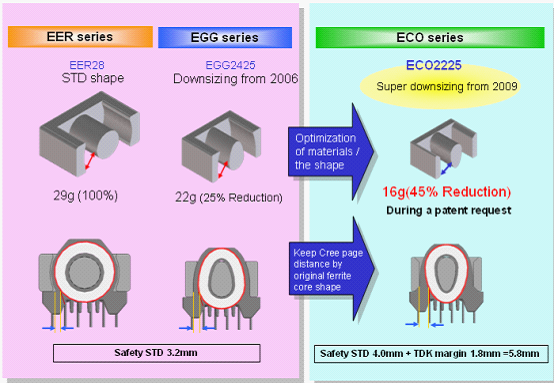活用高性能材質(zhì)的優(yōu)點(diǎn),以EER28市面上最常用的一種變壓器型號分析。由于密度更大,我們可以使變壓器更輕、更小。比如在同樣功率的情況下,用高性能材質(zhì)體積和重量會比普通材質(zhì)更小。這邊僅以EER28為例,我們將以ECO2225系列可以取代市場上的EER28,重量有45%的消減。