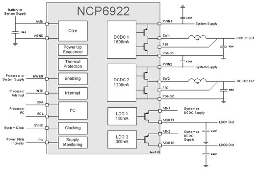 圖2:安森美半導(dǎo)體的NCP6922 mini-PMIC集成2路DC-DC、2路LDO及其它多種功能。