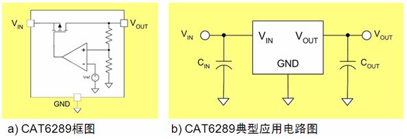 圖4:CAT6289超低工作電流NanoPower LDO框圖及典型應(yīng)用電路圖。