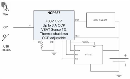 以NCP367為例,這是一款提供+30 V過壓保護及高達3 A過流保護、帶電池電壓檢測功能的保護IC(見圖5)。這器件保護便攜設(shè)備電池免受輸入過壓(在出現(xiàn)故障工作條件下會斷開系統(tǒng)與Vbus或AC-DC適配器的連接)、充電過流及充電過壓影響。NCP367提供最大值100 mΩ的低導(dǎo)通阻抗,幫助降低方案成本及電路板占用空間。支持高達3 A電流的能力幫助實現(xiàn)快速充電。典型值50 μA的極低電流消耗兼容于USB 500 μA閑置模式。這器件能用于1.5 A或500 mA兩種充電電流等級,非常適合手機等應(yīng)用。