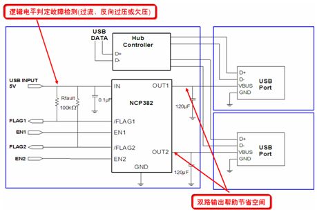 NCP382則是一款功率分配開關(guān),其設(shè)計針對很可能會遇到大的電容性負載或短路的應(yīng)用。實際上,越來越多便攜電子設(shè)備采用USB供電,但需要保護本地USB電源夠用受外部Vbus故障影響。NCP382能夠通過在輸出負載超過限流閾值或出現(xiàn)短路時切換至恒流模式,將輸出電流限制在期望的電平(0.5 A、1 A或1.5 A),從而提供過流保護。NCP381接收2.5 V至5.5 V的單路輸入,提供2路輸出。圖6是NCP382的典型應(yīng)用電路圖。