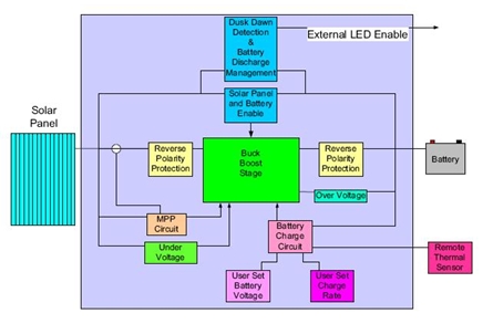 在白天時間系統(tǒng)對電池充電,而在夜間電池放電照亮定義的空間。雖然輸入能量不能保證,但輸出能量可在相當(dāng)長的時間保持不變。如果一個系統(tǒng)的大小不合適,電池可能因放電而損壞。要防止電池損壞,必須用 LED 電路抑制操作,防止電池耗盡。