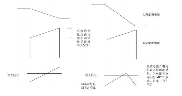 為了從功率可變的電源(即太陽能電池板)析取出最大的功率,太陽能控制器必須采用 MPPT。MPPT 必須首先找到最大功率點并及時調(diào)整環(huán)境條件,以保持控制器接近最大功率點。動態(tài) MPPT 用在系統(tǒng)發(fā)生改變的情況下。由于每個開關(guān)周期都在發(fā)生變化,太陽能電池板汲取的功率也會在每個周期有明顯的改變。動態(tài)MPPT利用太陽能電池板的電壓驟降乘以每個開關(guān)周期增加的電流,以確定將要產(chǎn)生的誤差信號來調(diào)節(jié)占空比。動態(tài)響應(yīng)可檢測 IV 曲線的斜率,從而建立一個功率斜坡,從誤差信號相交點建立一個代表占空比的功率。當(dāng)斜坡變化斜率從正到負時該周期結(jié)束,如圖 2 所示。