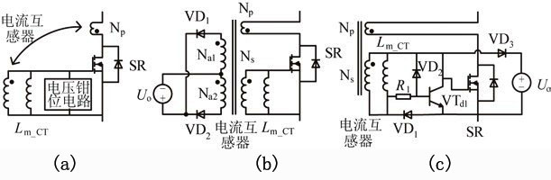 圖7為幾種典型的電流型驅(qū)動(dòng)方案。傳統(tǒng)的電流型驅(qū)動(dòng)方案如圖7(a)所示,整個(gè)驅(qū)動(dòng)電路包括一個(gè)電流互感器(CT)和一個(gè)電壓箝位電路。電路通過電流互感器對(duì)電流信號(hào)進(jìn)行采樣,并給同步管提供相應(yīng)的驅(qū)動(dòng)信號(hào),多余的驅(qū)動(dòng)能量被箝位電路消耗。該驅(qū)動(dòng)電路比較簡(jiǎn)單,但是有較大的驅(qū)動(dòng)損耗,限制了變流器效率的提高。因此有文獻(xiàn)提出了具有剩余驅(qū)動(dòng)能量回饋功能的電流型驅(qū)動(dòng)方案,如圖7(b)所示。該驅(qū)動(dòng)電路中多余的驅(qū)動(dòng)能量能通過輔助繞組回饋到主電路,從而可以較大的減少驅(qū)動(dòng)電路的損耗,并簡(jiǎn)化電流互感器的設(shè)計(jì),但是多繞組的電流互感器大大增加了生產(chǎn)成本。另有文獻(xiàn)提出了一種更為簡(jiǎn)單的電流型驅(qū)動(dòng)方案,如圖7(c)所示。該方案的電流互感器只需一個(gè)副邊繞組,同時(shí)也具有剩余驅(qū)動(dòng)能量回饋的功能,更加有利于實(shí)際的生產(chǎn)應(yīng)用。通過三極管VTd1,它可以準(zhǔn)確地檢測(cè)同步整流管應(yīng)該關(guān)斷的時(shí)刻,從而保證了同步整流電路的可靠性。