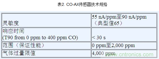 圖1所示為 Alphasense公司的CO-AX傳感器。表2是CO-AX傳感器技術(shù)規(guī)格摘要。