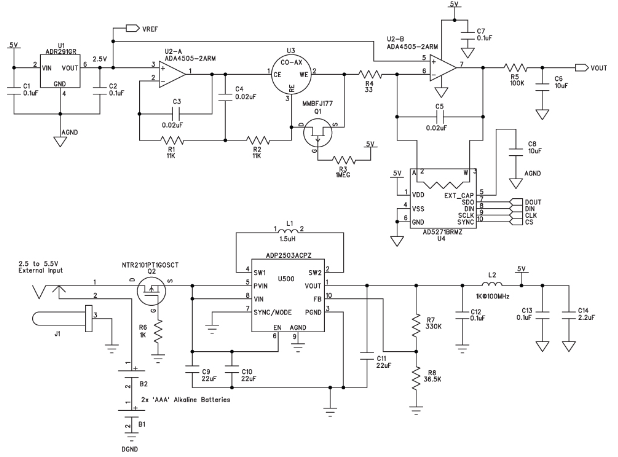 該電路由兩節(jié)AAA電池供電。使用二極管提供反向電壓保護會浪費寶貴的電能,因此本電路使用P溝道MOSFET (Q2)。該MOSFET通過阻塞反向電壓來保護電路,施加正電壓時導(dǎo)通。MOSFET的導(dǎo)通電阻小于100 mΩ,因此它引起的壓降遠小于二極管。除AAA電池以外,降壓-升壓調(diào)節(jié)器ADP2503還允許使用最高5.5 V的外部電源。在省電模式下工作時,ADP2503的功耗僅38 μA。由L2、C12和C13構(gòu)成的濾波器可消除模擬電源軌產(chǎn)生的任何開關(guān)噪聲。連接外部電源時,該儀表不是通過一個電路來斷開電池,而是利用一個插孔以機械方式斷開電池,從而避免電能浪費。