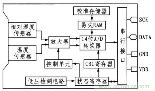 SHT15型傳感器是單片、多用途的智能傳感器,其中不僅包含基于濕敏電容器的微型相對濕度傳感器和基于帶隙電路的微型溫度傳感器,而且還有14位的A/D轉換器和2線串行接口。能輸出經過校準的相對濕度和溫度的串行數據,所以系統(tǒng)中不再使用傳統(tǒng)設計需要的多路轉換開關、A/D轉換器及信號調理電路,系統(tǒng)結構比較緊湊和簡單,SHTl5能在同一位置測量相對濕度和溫度。它的內部結構如圖1所示