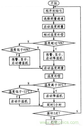 每次測得的數據要和規(guī)定值進行比較,如果在允許的范圍內,則程序進行下一步操作,如果不滿足要求.則應報警并將此刻的數據值顯示出來,在每次循環(huán)結束后。要經過1個小時(可以靈活選用)的延時.這主要是因為彈藥倉庫里有很多木制結構,揮發(fā)和吸收水分都有一個過程,經過一定延時再進行測量.可以避免傳感器長時間的工作和執(zhí)行機構的反復啟停,節(jié)約資源,同時可以延長系統(tǒng)的使用壽命。每經過3次(根據需要可以適當選擇)循環(huán)測量后,單片機控制打印機將3次測量的溫/濕度數據打印出來,便于報表和存檔。