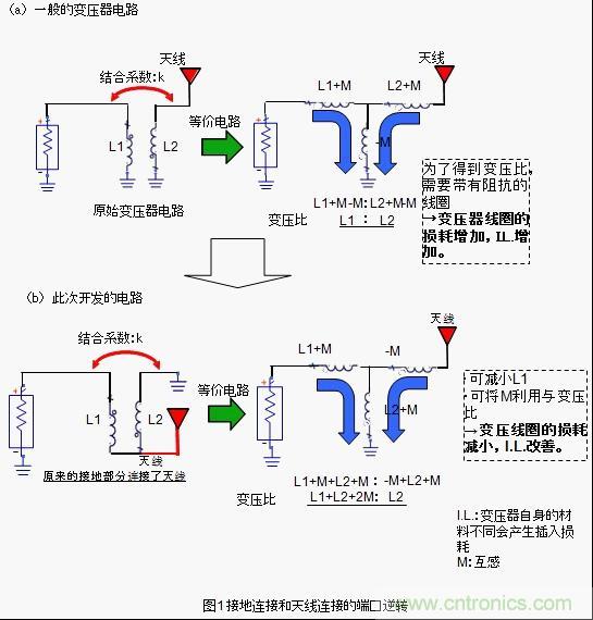 為了削減這種阻抗成分并維持變壓比,我們采用了圖1所示的高頻變壓器的構(gòu)造。該構(gòu)造跟普通的變壓器構(gòu)造相反,它將接地連接端口跟天線連接端口完全逆反。因此,才能達到如圖1所示的變壓比。使用該構(gòu)造的話,因結(jié)合產(chǎn)生的互感M值會反應(yīng)到變壓器,變壓器中使用的線圈L值會減小,由于高頻變壓器的阻抗成分I.L.可以被抑制得很小。