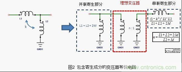 如果在這樣的天線中安裝一定變壓比的變壓器,是不能只整合一個band的阻抗的。所以,天線用變壓器,必備的設(shè)計需求是要使變壓比適應(yīng)天線的阻抗頻率特性。這種適應(yīng)方法如圖2所示,是一種將理想的變壓部分和寄生成分部分分解開來的等效電路。