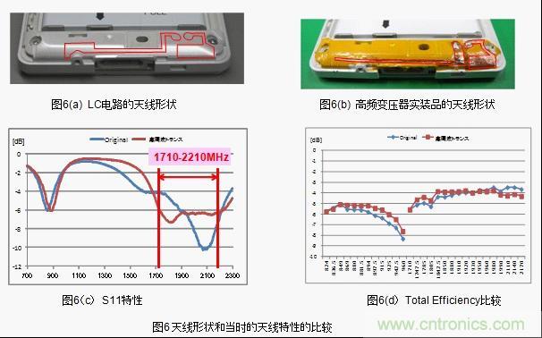 結(jié)果顯示,low band 情況下LC電路和高頻變壓器都不可能達到「S11<-6dB」(反射損耗1.2dB)。而high band情況下,達到「S11<-6dB」范圍的,如果使用LC電路的話是300MHz,而使用高頻變壓器的話則是500MHz,達到了66%的改善效果。(圖6(c)) 。此外,LC電路和高頻變壓器中天線的綜合特性顯示「Total Efficiency」,low band的高頻側(cè)也得到了0.6dB的改善效果。(圖6(d))。這種改善效果正是由于帶寬的廣帶寬化和I.L.得到了改善。