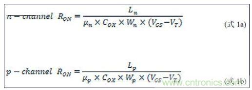 在VIN為各種電平條件下,p溝道和n溝道RON的并聯(lián)值形成并聯(lián)結(jié)構(gòu)的RON特征(圖2)。RON隨VIN的變化曲線在不考慮溫度、電源電壓和模擬輸入電壓對RON影響的情況下為直線。為使信號損耗和傳輸延遲最小,理想情況下的RON應(yīng)盡量小。然而,降低RON將增大MOSFET硅片的寬度/長度(W/L)比,從而造成較高的寄生電容和較大的硅片面積。這種較大的寄生電容降低模擬開關(guān)的帶寬。如果不考慮W和L,RON是電子和空穴遷移率(μn和μp)、氧化物電容(COX)、門限電壓(VT)及信號電壓、n溝道及p溝道MOSFET的信號電壓VGS (VIN)的復合函數(shù),如式1a和1b所示。