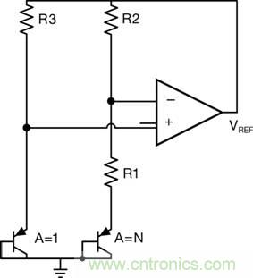 電阻器R2和R3分別可確定通過Q1和Q2 的電流值。R2和R3的變化可導(dǎo)致參考電壓(公式5)的正溫度系數(shù)不準(zhǔn)確。不過,可通過對電阻器R2與R3進(jìn)行良好匹配來降低該變化所引起的誤差。