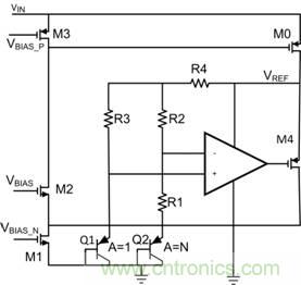 因此,輸出電壓對溫度和工藝變化極為敏感。要避免這種問題,就必須創(chuàng)建一個(gè)更為理想的跟隨器,其中 M4 是反饋環(huán)路的一部分(圖3)。