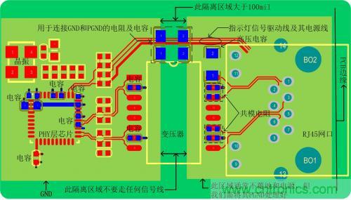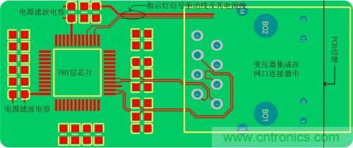 變壓器沒有集成在網(wǎng)口連接器里的參考電路PCB布局、布線圖,下面就以圖 2介紹以太網(wǎng)電路的布局、布線需注意的要點(diǎn)。