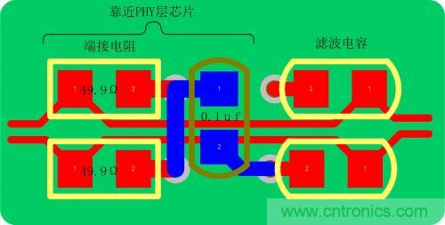 c)差分信號終端電阻(49.9Ω,有的PHY層芯片可能沒有)必須靠近PHY層芯片的Rx±、Tx±管腳放置,這樣能更好的消除通信電纜中的信號反射;