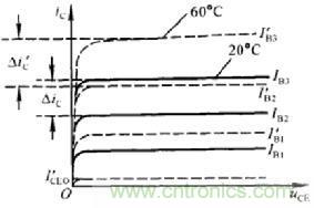 溫度對(duì)輸出特性的影響:如圖3實(shí)線,虛線分別所示為20℃和60℃時(shí)的特性曲線,可見(jiàn),溫度升高時(shí),由于輸入特性左移,導(dǎo)致集電極電流增大。