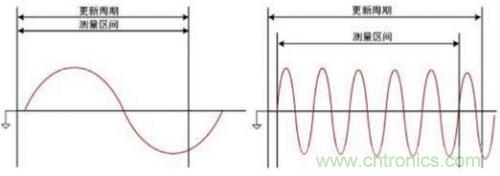 3.選擇合適的量程、更新率和同步源對(duì)功率分析儀的測(cè)量準(zhǔn)確性至關(guān)重要。例如當(dāng)更新周期小于被測(cè)信號(hào)周期時(shí),如下圖4所示,整個(gè)更新周期內(nèi)的數(shù)據(jù)成為測(cè)量區(qū)間,整個(gè)更新周期內(nèi)的采樣數(shù)據(jù)將被平均,因此影響測(cè)量結(jié)果的準(zhǔn)確性。在這種情況下需要增大更新周期,使得包含更多周期的被測(cè)信號(hào)進(jìn)入測(cè)量區(qū)間;