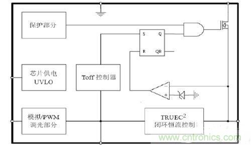 所謂開環(huán),不以檢測到的輸出電流值來做發(fā)出PWM信號的參考。所謂的閉環(huán),即真正檢測輸出電流值,以此為標準來發(fā)出PWM信號。從電路拓撲上,二者沒有區(qū)別。但是在芯片內(nèi)部對檢測到的如圖1 CS腳電感電流信號,做專利技術(shù)處理,如圖2 TRUEC2部分。這樣,就檢測到了電感電流的平均值,也就是輸出電流的平均值。芯片針對檢測到的值,控制輸出占空比,實現(xiàn)了閉環(huán)控制。