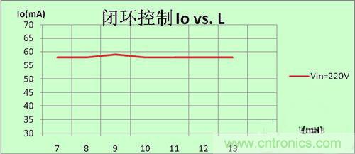 圖4可見,線性調(diào)整率為0,因為全閉環(huán)控制逐周期精確控制,輸入有任何變化,芯片會馬上檢測到并作相關(guān)的調(diào)整以便得到同樣的輸出;同理,如圖5及圖6,當輸出電壓變化,電感量變化時,芯片也會作相關(guān)的調(diào)整;正是因為我們的全閉環(huán)高精度恒流控制方法,使電源做到了真正的恒流。這樣,量產(chǎn)的一致性可以控制到小于±1%.