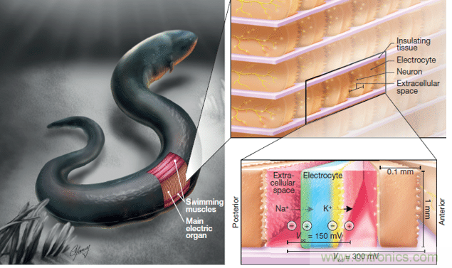 電鰻的所有放電體可以同時(shí)翻轉(zhuǎn),它們的微小電壓加起來就能產(chǎn)生強(qiáng)大的電能。