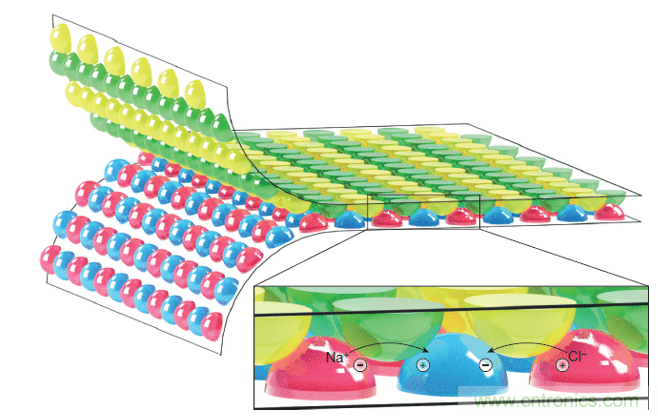 紅色凝膠含有鹽水,而藍(lán)色凝膠含有淡水。離子原本會(huì)從紅色凝膠流向藍(lán)色凝膠,但由于基板的間隔,無法出現(xiàn)這樣的流動(dòng)。與此同時(shí),與這塊基板對(duì)應(yīng)的另一塊基板上布置了綠色和黃色凝膠,當(dāng)它們橋接在藍(lán)色和紅色凝膠之間的空隙時(shí),就能為離子運(yùn)動(dòng)提供通道。