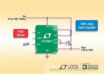 LTC7000是一款快速、高壓側(cè) N 溝道 MOSFET 柵極驅(qū)動(dòng)器,主要接收一個(gè)參考于地的低電壓數(shù)字輸入信號(hào),并以 35ns 的傳播延遲完全接通或關(guān)斷一個(gè)其漏極可高出地電位達(dá) 135V 的高壓側(cè) N 溝道 MOSFET。13ns的快速上升和下降時(shí)間 (當(dāng)驅(qū)動(dòng)一個(gè) 1000pF 負(fù)載) 最大限度降低了