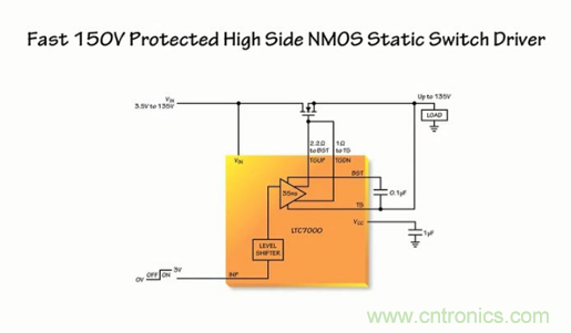 LTC7000 在 INP 引腳上接收一個(gè)參考于地的低電壓數(shù)字信號(hào)、把該信號(hào)電平移位至高達(dá) VIN 電壓。并控制片內(nèi)低阻抗上拉和下拉器件,能快速接通或判斷一個(gè)其漏極可高出地電位達(dá) 135V 的高壓側(cè) N 溝道 MOSFET。從低電壓 INP 信號(hào)至得到全面強(qiáng)化或被完全關(guān)斷的 N 溝道 MOSFET 之傳播延遲約為 35ns,這也促成了許多應(yīng)用。