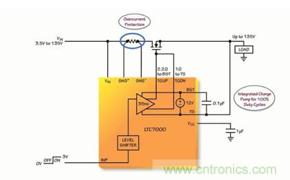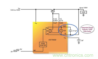 開關(guān)損耗。其內(nèi)部充電泵全面強(qiáng)化一個(gè)外部 N 溝道 MOSFET 開關(guān),因而使之能無限期地保持導(dǎo)通。