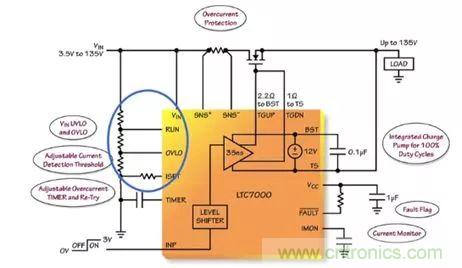 LTC7000 能夠避免負(fù)載遭受 VIN 引腳上的過壓和欠壓情況的損壞。“一個(gè)連接在 VIN 和地之間、且抽頭連接至 RUN 和 OVLO 引腳的簡(jiǎn)單電阻分壓器將設(shè)定一個(gè)針對(duì)負(fù)載的有效操作窗口。當(dāng) VIN 位于由 RUN 和 OVLO 引腳所設(shè)定的操作窗口之外時(shí),則關(guān)斷外部 MOSFET,并保護(hù)負(fù)載免遭潛在損壞或發(fā)生故障。” Mark Mullen這樣談到。