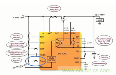 因?yàn)長(zhǎng)TC7000 還具有一個(gè) TIMER 引腳,因此過流情況不會(huì)立刻關(guān)斷外部 MOSFET。在 TIMER 引腳和地之間連接一個(gè)電容器,它用于設(shè)定在外部 MOSFET 在過流故障情況下被關(guān)斷之前的延遲周期,該關(guān)斷延遲周期可設(shè)定在最短 1.4µs (如果 TIMER 引腳開路) 到幾十或幾百 ms (如果電容器為µF 級(jí)) 的范圍內(nèi),布設(shè)在 TIMER 引腳上的同一個(gè)電容器還負(fù)責(zé)設(shè)定一個(gè)冷卻周期。