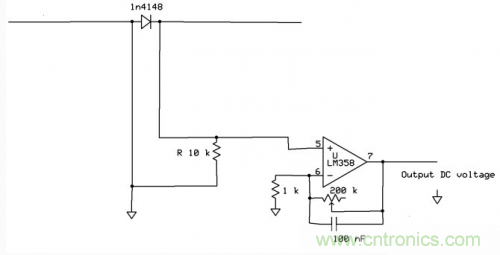 DC的輸出電壓還可以用LM358上的另一個運放在進行一次放大。圖中的100nF電容起到對整流后的電信號進一步濾波的作用。