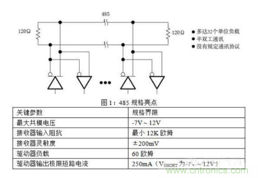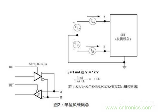 2.1.2單位負載概念掛接在同一485通訊總線上的驅(qū)動器和接收器,其最大數(shù)量取決于它們的負載特性。驅(qū)動器和接收器的負載都是相對單位負載而衡量的。485標(biāo)準(zhǔn)規(guī)定一根傳輸總線上最多可以掛接32個單位負載。單位負載定義為:在12V共模電壓環(huán)境中,允許通過穩(wěn)態(tài)負載1mA電流,或者是在-7V共模電壓環(huán)境中,允許通過穩(wěn)態(tài)負載0.8mA電流。單位負載可能由驅(qū)動器、接收器和失效保護電阻組成,但不包括AC終端匹配電阻。