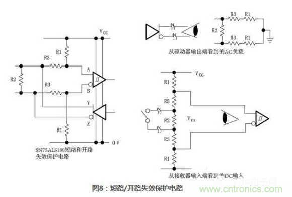 使用這樣的內(nèi)部上下拉電阻允許總線不進行終端匹配,但是會顯著的降低最大信號速率和可靠性。圖7給出了一些485接口通用外置失效保護電路,每個電路都盡力維持接收器輸入端電壓不小于最小臨界值并在一個或多個故障條件(開路、空閑、短路)下,維持一個已知的邏輯狀態(tài)。