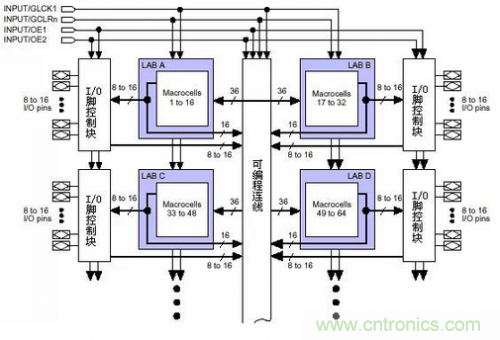 我們先看一下這種PLD的總體結(jié)構(gòu)(以MAX7000為例,其他型號的結(jié)構(gòu)與此都非常相似):