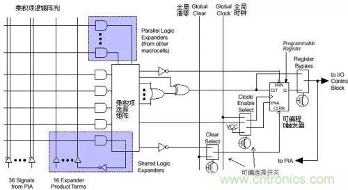 左側(cè)是乘積項陣列,實際就是一個與或陣列,每一個交叉點都是一個可編程 熔絲,如果導(dǎo)通就是實現(xiàn)“與”邏輯。后面的乘積項選擇矩陣是一個“或”陣列。兩者一起完成組合邏輯。圖右側(cè)是一個可編程D觸發(fā)器,它的時鐘,清零輸入都可 以編程選擇,可以使用專用的全局清零和全局時鐘,也可以使用內(nèi)部邏輯(乘積項陣列)產(chǎn)生的時鐘和清零。如果不需要觸發(fā)器,也可以將此觸發(fā)器旁路,信號直接 輸給PIA或輸出到I/O腳。