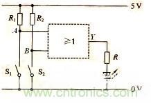 汽車給人們的出行帶來方便、舒適,但其安全性也很重要。如圖所示為簡單的車門報警電路圖。圖中的兩個按鈕開關(guān)S1、S2分別裝在汽車的兩道門上。駕駛員離開汽車時,兩車門均處于關(guān)閉狀態(tài),跟兩車門對應(yīng)的開關(guān)S1、S2均閉合,即輸入邏輯均為0,那么輸出也是邏輯0,電流不通過發(fā)光二極管,這時發(fā)光二極管不會發(fā)光報警;只要其中任何一個車門打開時,S1或S2就處于斷開狀態(tài),即輸入為邏輯1,那么輸出也是邏輯1,這時就有電流通過發(fā)光二極管,使其發(fā)光報警。如果有四個門,原理也是一樣,通過指示燈發(fā)光報警就可以判斷門是否都關(guān)好了。
