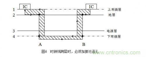 在布線時盡量少穿過孔,因為過孔阻抗和線阻抗不一樣,存在阻抗突變,從而產(chǎn)生駐波使信號變壞,容易形成輻射,尤其是在時鐘需要穿層時,要做技術處理,時鐘線跨層時的處理如圖6所示。