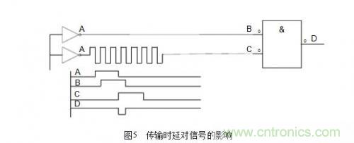 (3)保證信號在PCB上可靠的傳輸,確保信號的完整性。這里面主要的問題一般包括時延、阻抗不匹配、地彈跳、串音等。這不但影響到電子器件的穩(wěn)定工作,還會產(chǎn)生電磁干擾。一般在高速邏輯設計中最容易碰到時延問題,處理不好會產(chǎn)生不希望的脈沖干擾。傳輸時延對信號的影響如圖5所示。