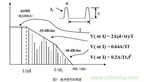 在EMC中,除了基本頻率外,還需考慮諧波因素,通常取十倍頻,但在數(shù)字電路中卻有些不同,比如在時鐘電路和邏輯門電路中,輻射帶寬與數(shù)字信號的上升沿或下降沿有關系,而不是數(shù)字信號的重復周期,其關系為:rtF?/1max?,其中rt是脈沖的上升沿時間。例如,典型時鐘驅動的邊沿速率是2ns,此時,maxF≈160MHz,再考慮十倍頻,則此時鐘電路可能產(chǎn)生直到1.6GHz的輻射帶寬。所以在選擇器件時要選擇慢速的邏輯器件系列,因為器件對電磁輻射貢獻的大小與工作頻率無直接關系而只取決于邊沿速率(這和從電路功能設計上選擇快速器件是矛盾的,在電路設計時需要折中考慮)。還有從器件的抗擾能力上來說,CMOS器件是最好的,因為它的噪聲容限高。從封裝上來說,BGA是最好的,因為它的引線很短。脈沖信號的頻譜如圖3所示。