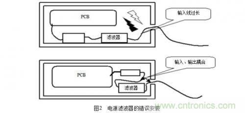 (3)在電源電路(尤其是開關電源中),操縱電路,控制電路,以及轉換電路中消除產(chǎn)生的干擾。在工程實際中,一個最值得注意的地方是電源濾波器的安裝,常見的濾波器的錯誤安裝如圖2所示。