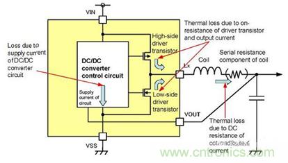 使用DC/DC轉(zhuǎn)換器所期待的最大目的之一是高效率地轉(zhuǎn)換能量。提高效率的方法在于降低損耗。如圖3所示,作為發(fā)生損耗的問題,可以列舉IC的消耗電流、驅(qū)動器晶體管導通電阻產(chǎn)生的熱損耗,線圈的串聯(lián)連接而產(chǎn)生的損耗等重大原因。