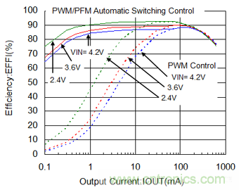 XC9236具有對應負載變化自動地轉(zhuǎn)換PFM工作和PWM工作的功能。這種功能可同時滿足輕負載時提高效率和重負載時保持低紋波,有利于在整個負載范圍提高效率。(參照圖4)
