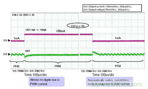 圖3 PFM控制和PWM控制自動轉(zhuǎn)換波形(負載電流:1mA⇔100mA)
