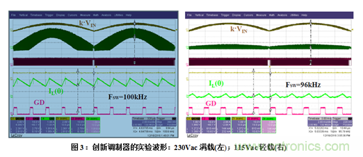 具體地講,圖3所示是開關(guān)頻率在寬輸入電壓(230Vac-左和115Vac-右)范圍和所有負(fù)載條件中(CCM-左, DCM - 右)保持恒定。與標(biāo)準(zhǔn)LM-FOT方法相比,本文提出的創(chuàng)新調(diào)制器的性能大幅改進(jìn),特別是在高壓線DCM運行模式更為明顯,如圖4所示。