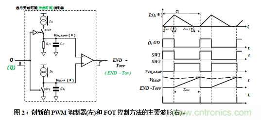 本文介紹一種創(chuàng)新的自適應(yīng)穩(wěn)壓器(AC/DC或DC/DC)脈寬調(diào)制器(PWM),基于“固定關(guān)斷時間(FOT)”或“恒定導(dǎo)通時間(COT)”控制方法,可以在全工況下(例如,滿負(fù)載CCM或中低負(fù)載DCM模式,寬輸入輸出電壓)以恒定開關(guān)頻率工作,無轉(zhuǎn)換器的寄生參數(shù)(例如,功率開關(guān)和濾波電感器的電阻)的負(fù)面影響。此外,本文提出的調(diào)制器電路與轉(zhuǎn)換器拓?fù)錈o關(guān)(升壓、降壓、反激式等),只與功率開關(guān)管柵極驅(qū)動邏輯信號(GD)有關(guān),節(jié)省芯片引腳數(shù)量,且/或降低設(shè)計復(fù)雜程度。