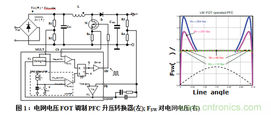 例如,用FOT方法控制CCM PFC前級升壓穩(wěn)壓器,導(dǎo)致開關(guān)頻率隨電網(wǎng)電壓和負(fù)載條件而發(fā)生明顯變化[1]。按照實時電網(wǎng)電壓調(diào)制關(guān)斷時間,可以降低開關(guān)頻率(TOFFKt Vin, pksinθ), 如圖1所示,只要升壓級是CCM模式,最終開關(guān)頻率是恒定的[2],如圖1右圖所示。