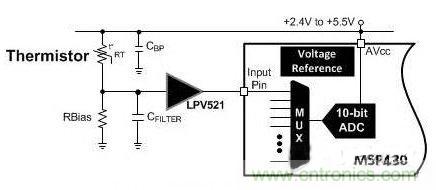 從技術上講,熱敏電阻是一種電阻器,它的電阻值隨溫度的變化而變化。如圖1中所示,需要一個偏置電路和少數(shù)幾個外部組件,在這里,偏置電阻器和熱敏電阻組成了一個分壓器,并且被接到一個可選運算放大器上,這個運算放大器與微控制器 (MCU) 的模數(shù)轉(zhuǎn)換器 (ADC) 相連,從而將熱敏電阻的電阻值轉(zhuǎn)換為一個溫度值。